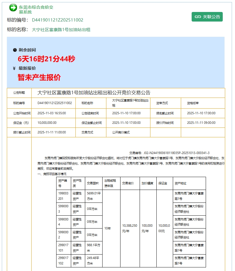 根据东莞市公共资源交易中心网站显示,东莞市虎门镇大宁富康路1号加油站进行网上公开竞价,本次交易竞投时间为:2025年11月11日 09点00分至2025年11月11日11点00分。