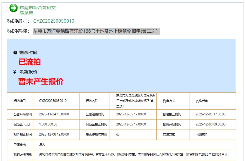 东莞市万江莞穗路万江段166号土地及地上建筑物招租(第二次)出租项目流拍。
