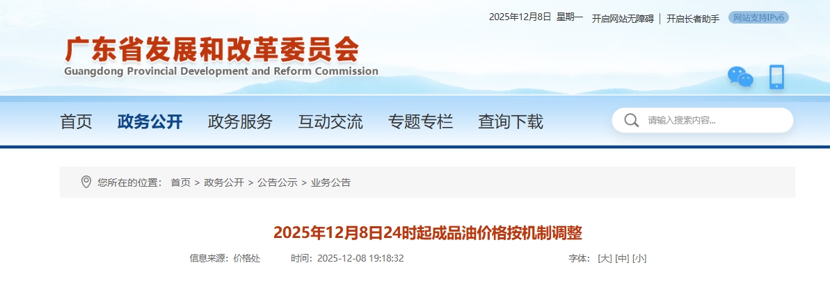 根据广东省发展和改革委员会公告,12月8日24时起成品油价格按机制下调。