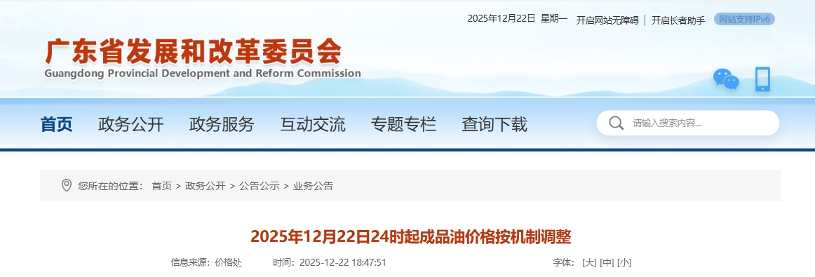 根据广东省发展和改革委员会公告,2025年12月22日24时起成品油价格按机制调整。