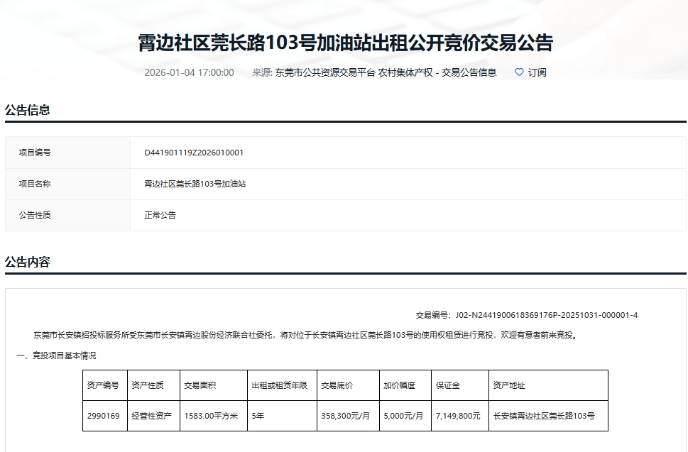 根据广东省公共资源交易平台网站显示,长安镇霄边社区莞长路103号加油站进行网上公开竞价,本次交易竞投时间为:2026年01月15日 09点00分至2026年01月15日 11点00分。