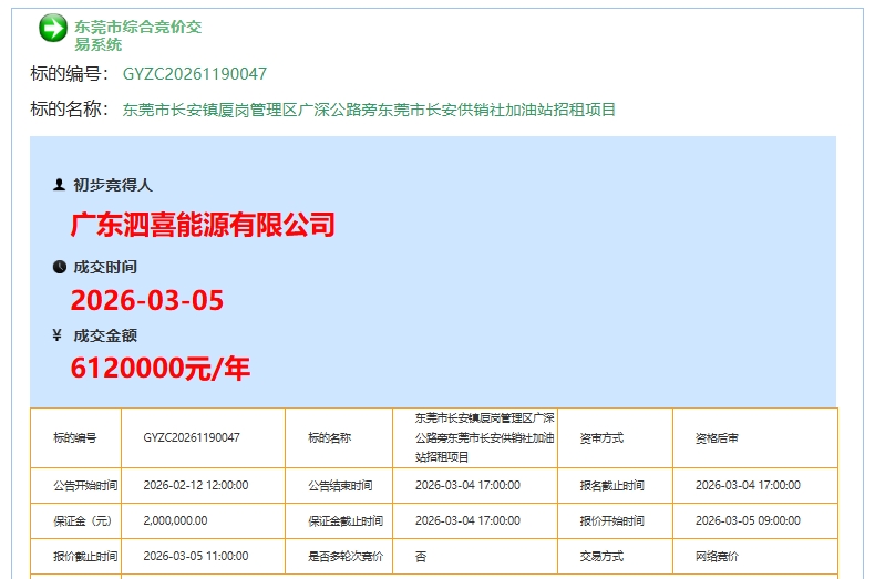 根据东莞市公共资源交易中心网站显示,3月5日,位于东莞市长安镇厦岗管理区广深公路旁东莞市长安供销社加油站