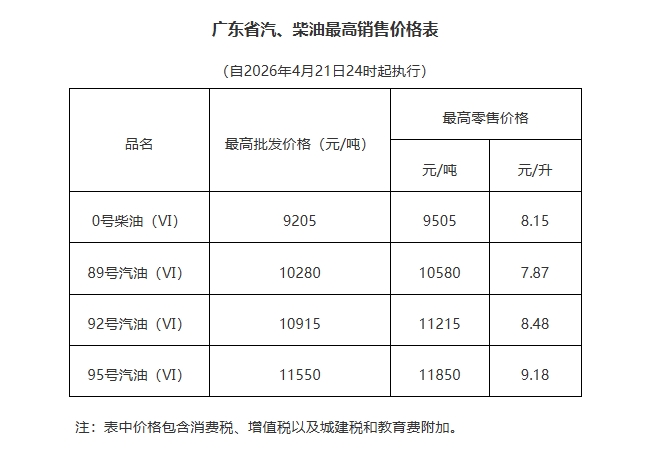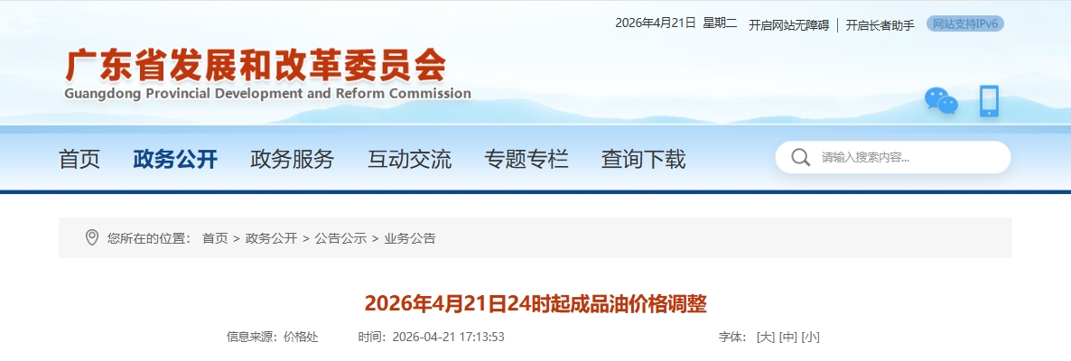 根据广东省发展和改革委员会公告,2026年4月21日24时起成品油价格按机制调整。