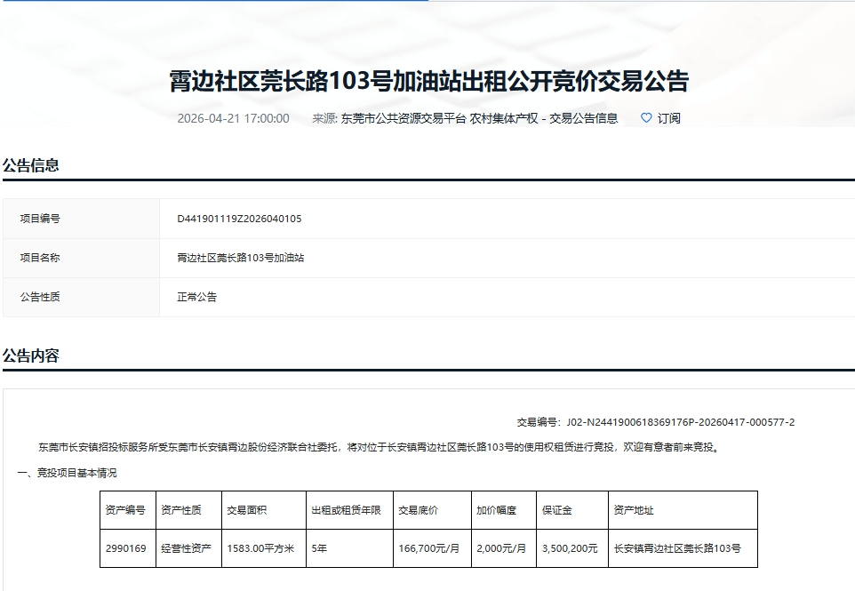 根据广东省公共资源交易平台网站显示,长安镇霄边社区莞长路103号加油站进行网上公开竞价,本次交易竞投时间为:2026年04月29日 09点00分至2026年04月29日 11点00分。