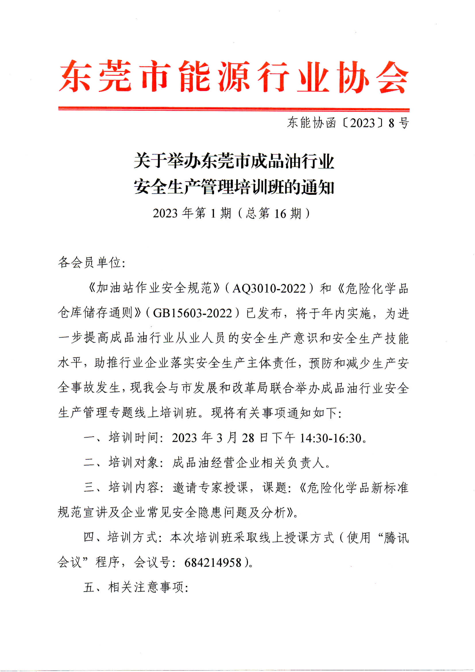 关于举办东莞市成品油行业安全生产管理培训班的通知