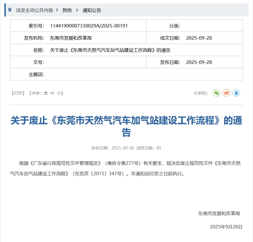 近日,东莞市发展和改革局于官网发布关于废止《东莞市天然气汽车加气站建设工作流程》的通告。