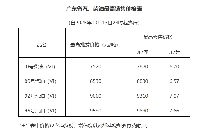 根据国家成品油价格形成机制,结合近一段时期国际市场油价变化情况,国家发展改革委决定自2025年10月13日24时起下调国内成品油价格,即在现行价格的基础上,我省汽、柴油价格每吨分别下调75元和70元。调整后,我省成品油最高销售价格见下表。
