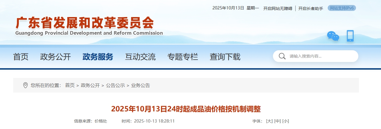 根据广东省发展和改革委员会公告,10月13日24时起成品油价格按机制下调。