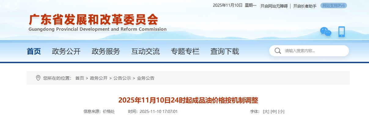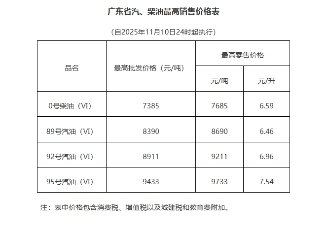 根据广东省发展和改革委员会公告,2025年11月10日24时起成品油价格按机制调整。