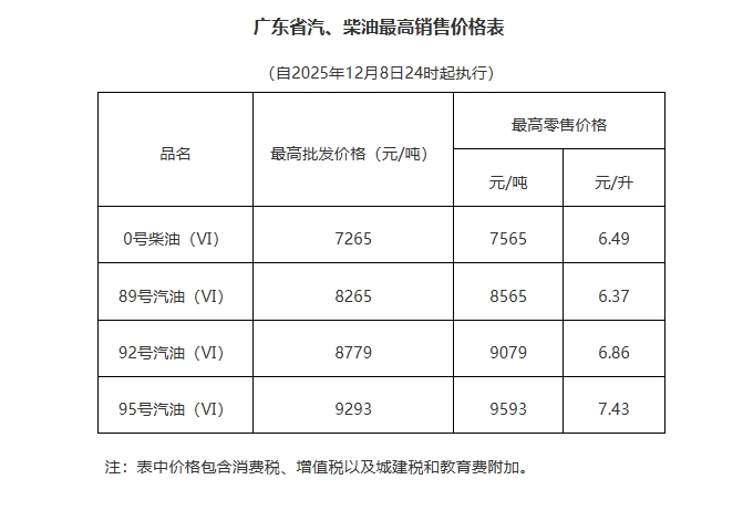 根据广东省发展和改革委员会公告,12月8日24时起成品油价格按机制下调。