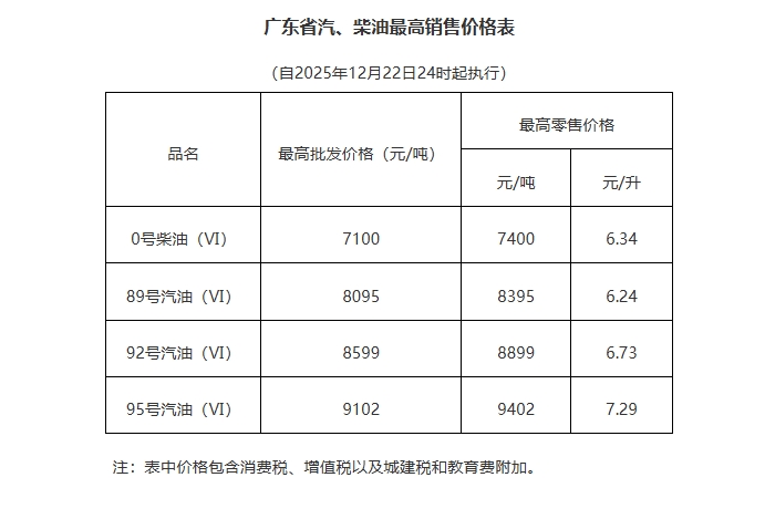 根据广东省发展和改革委员会公告,2025年12月22日24时起成品油价格按机制调整。