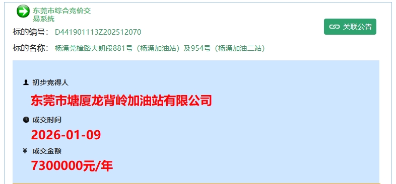 位于东莞市杨涌莞樟路大朗段881号(杨涌加油站)及954号(杨涌加油二站)由东莞市塘厦龙背岭加油站有限公司以¥7,300,000元/年初步竞得。(点击此处可浏览详情)