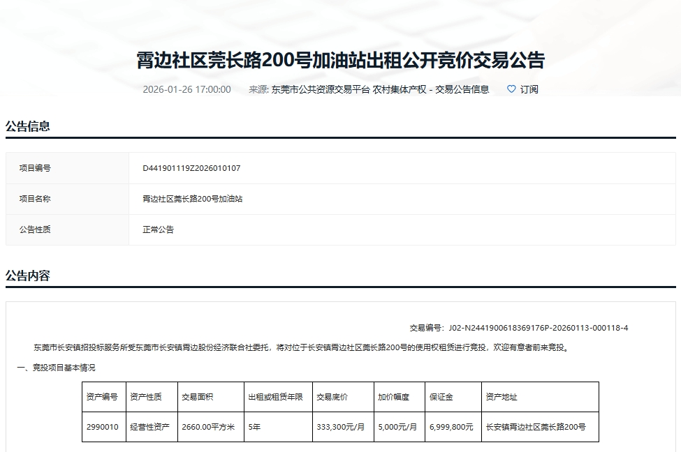 根据广东省公共资源交易平台网站显示,长安镇霄边社区莞长路200号加油站出租再次进行网上公开竞价,本次交易竞投时间为:2026年02月06日 09点00分至2026年02月06日 11点00分。