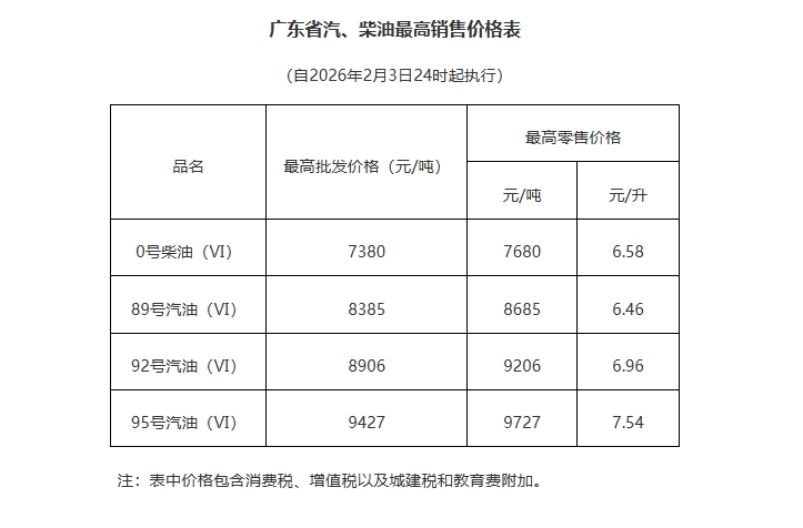 根据广东省发展和改革委员会公告,2月3日24时起成品油价格按机制上调。