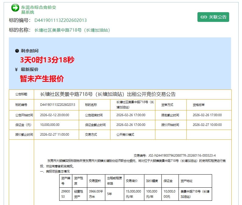 根据东莞市公共资源交易平台网站显示,大朗镇美景中路718号(长塘加油站)进行网上公开竞价,本次交易竞投时间为:2026年02月27日10点00分 至2026年02月27日11点00分。
