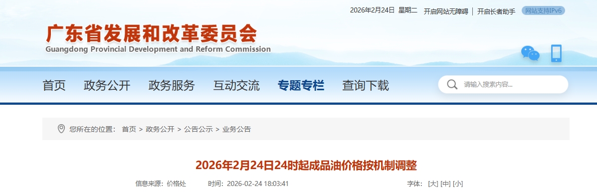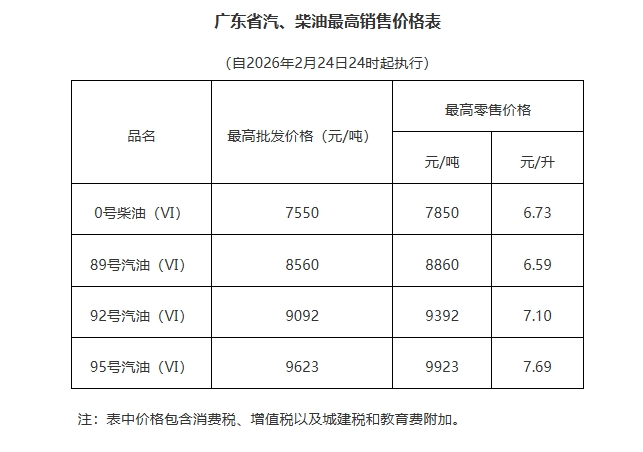 根据广东省发展和改革委员会公告,2月24日24时起成品油价格按机制上调。