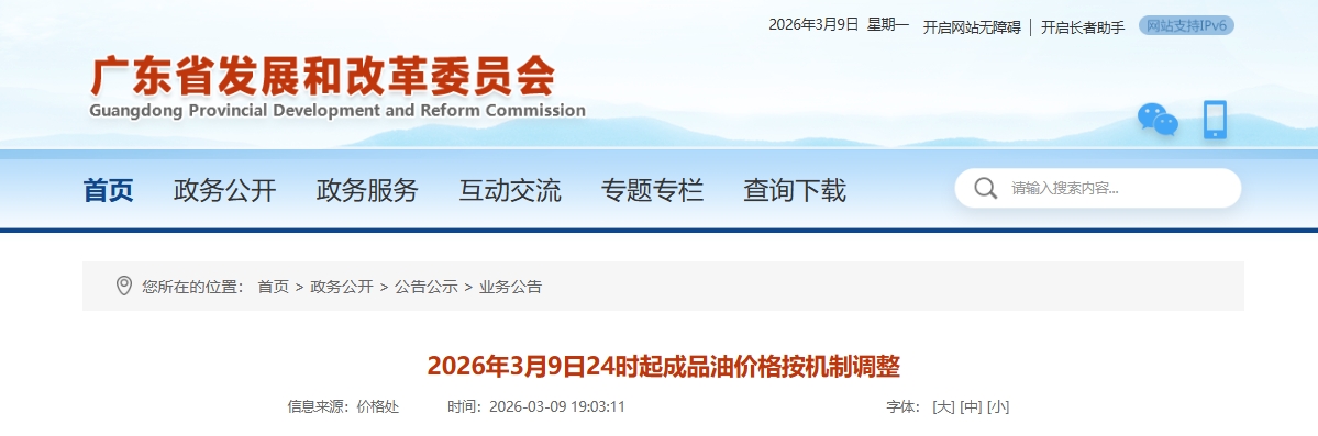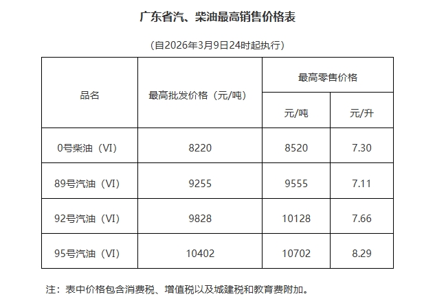 根据广东省发展和改革委员会公告,3月9日24时起成品油价格按机制上调。